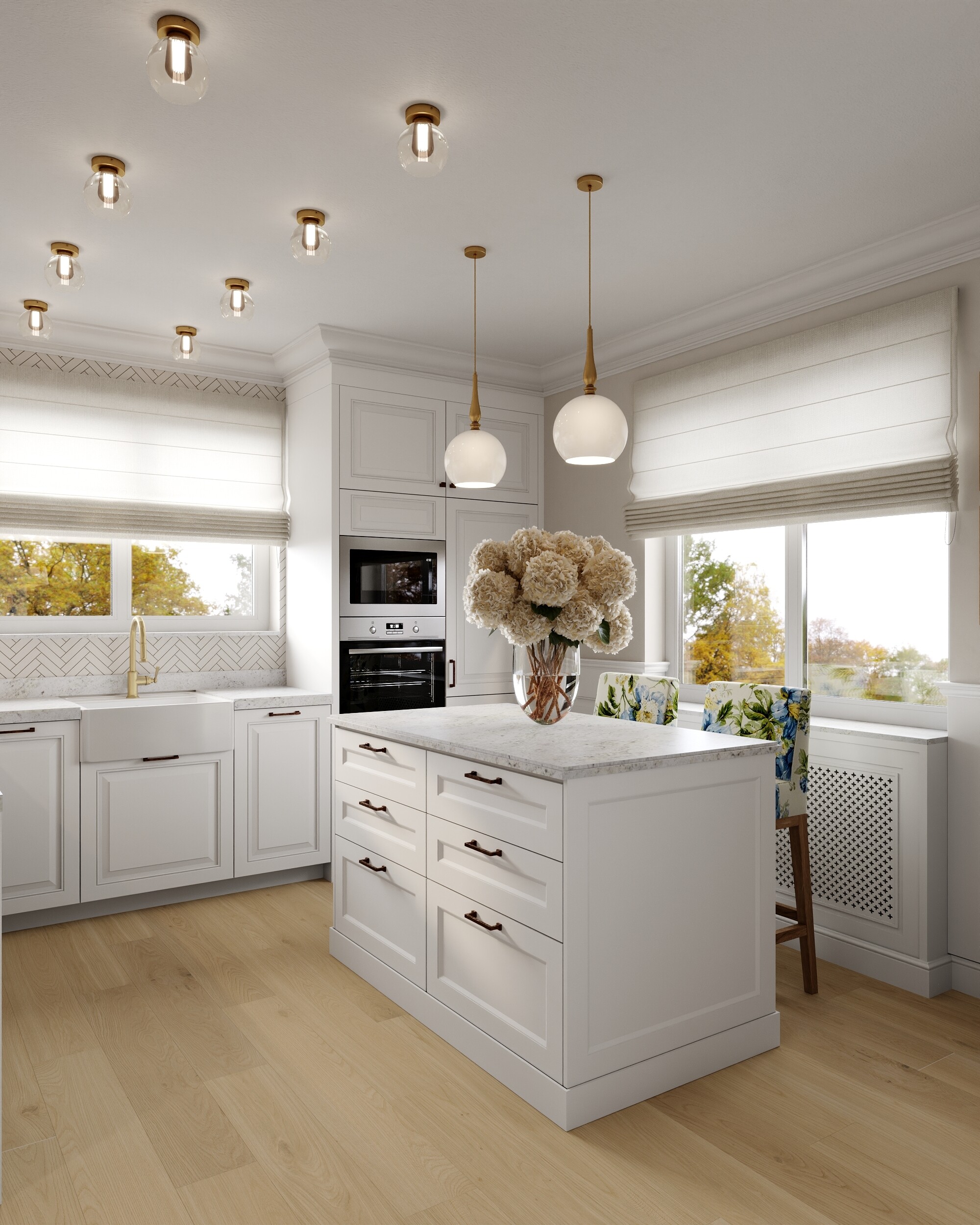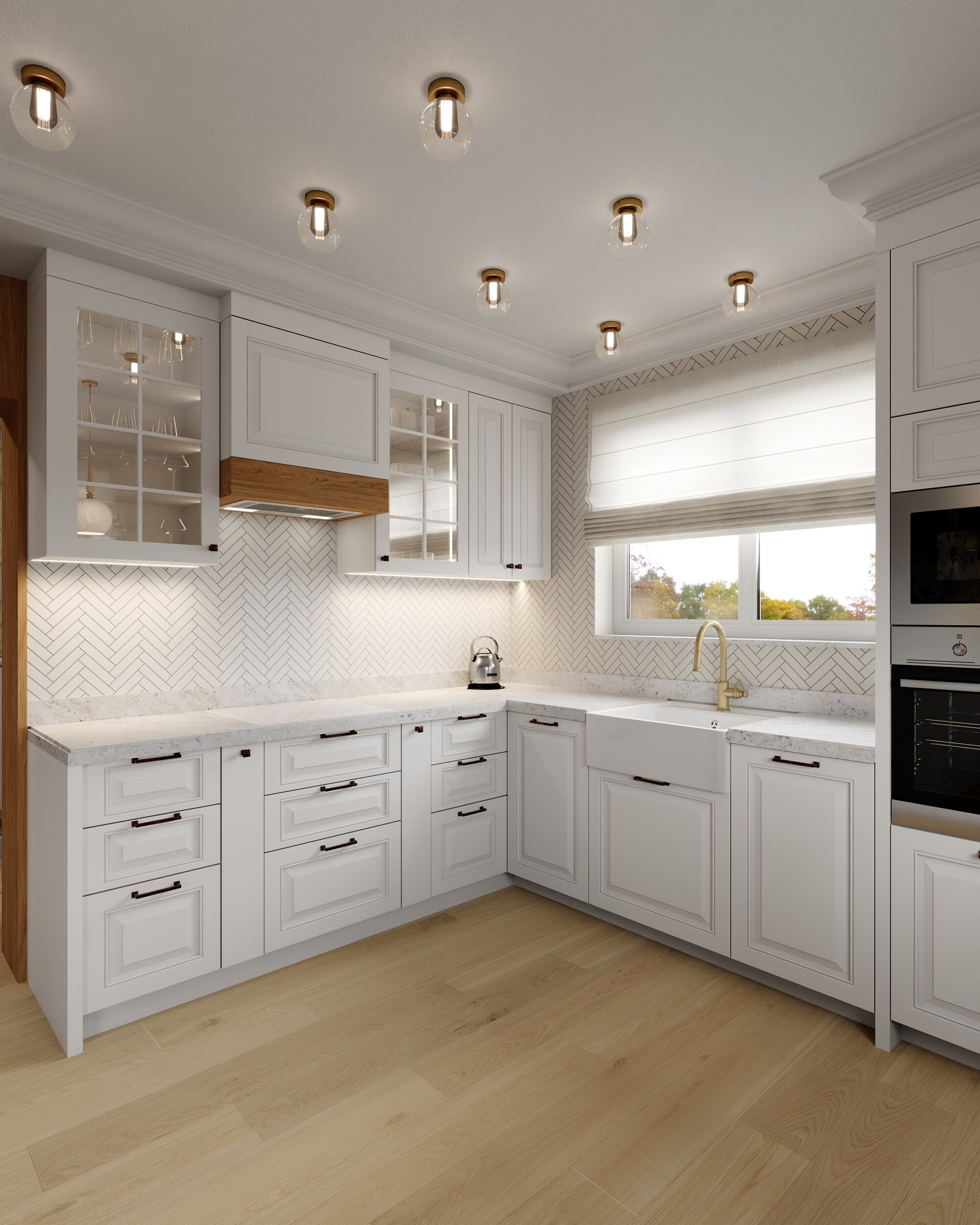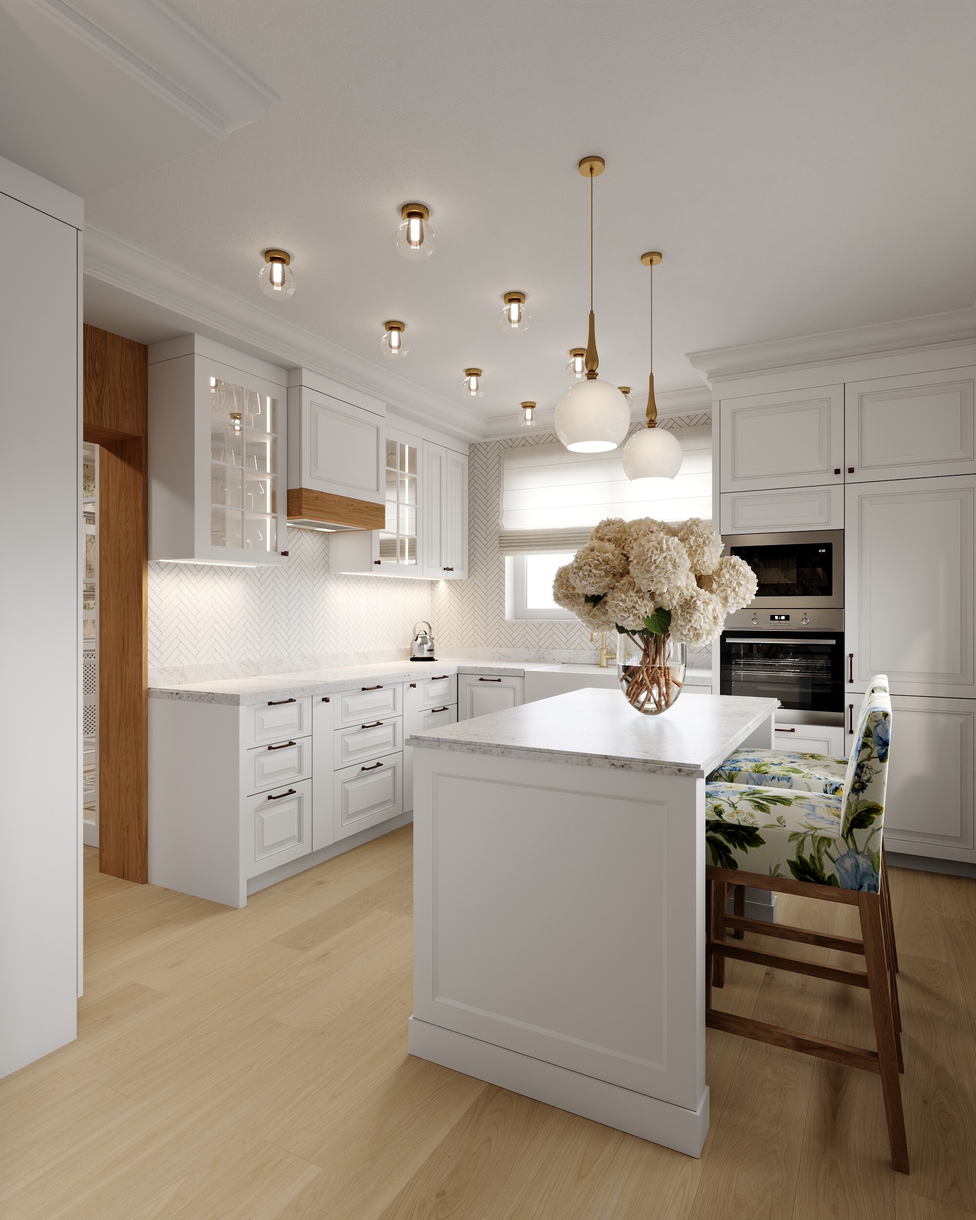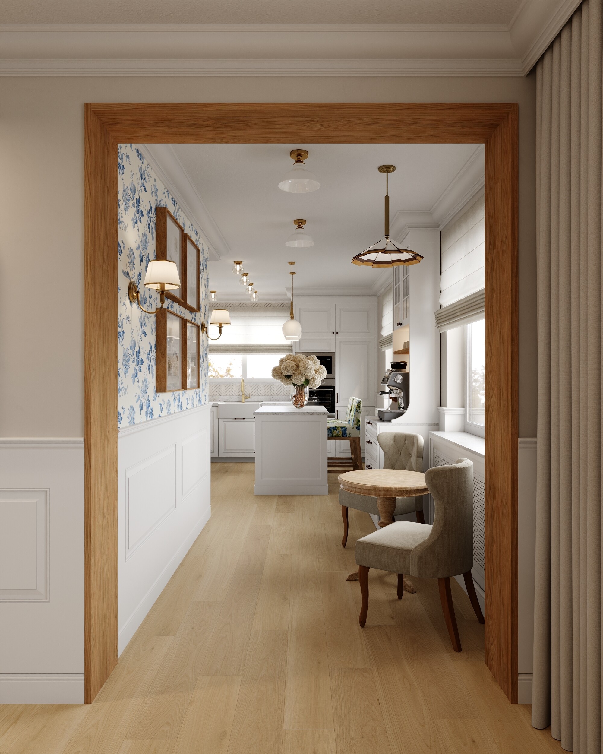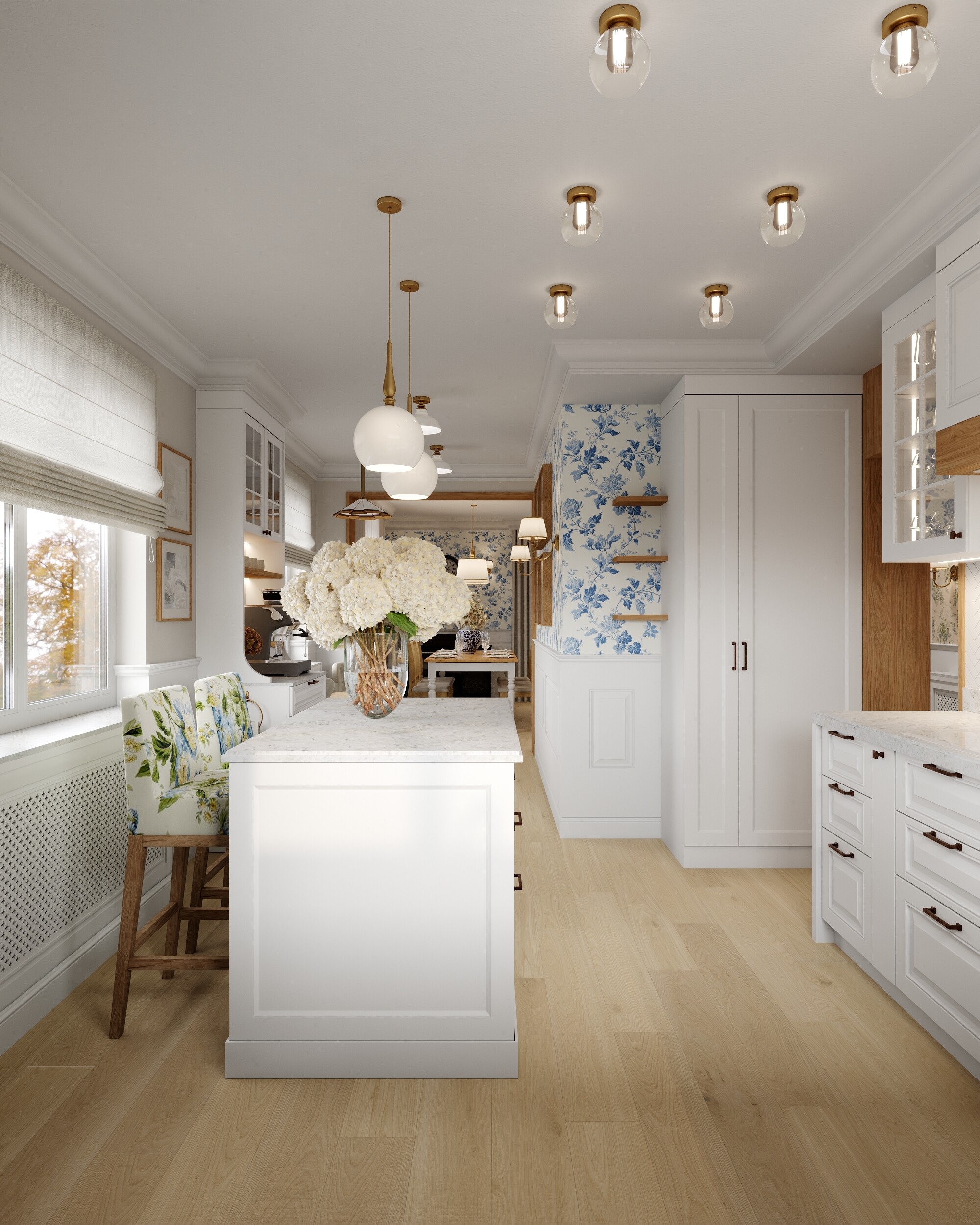 Baby blue – delikatny, pastelowy błękit jako kolor przewodni szafek kuchennych, frontów kredensów lub wyspy. Biel i krem – na ścianach, blatach z kamienia lub w płytkach podłogowych. Naturalne drewno pojawia się w blatach kuchni, stołu, półkach, podłodze – dodaje ciepła i rustykalnego charakteru. Akcenty ciemniejsze w kolorze postarzanego mosiądzu przełamują lekkość baby blue i dodają charakteru.