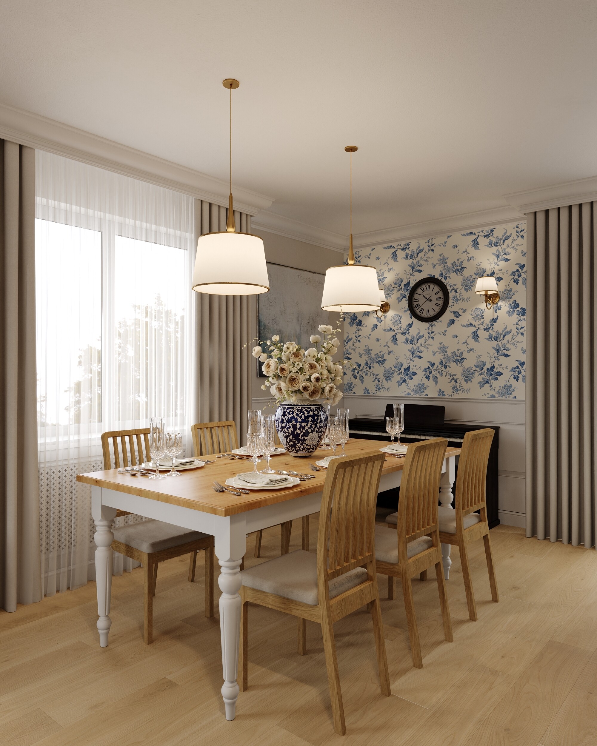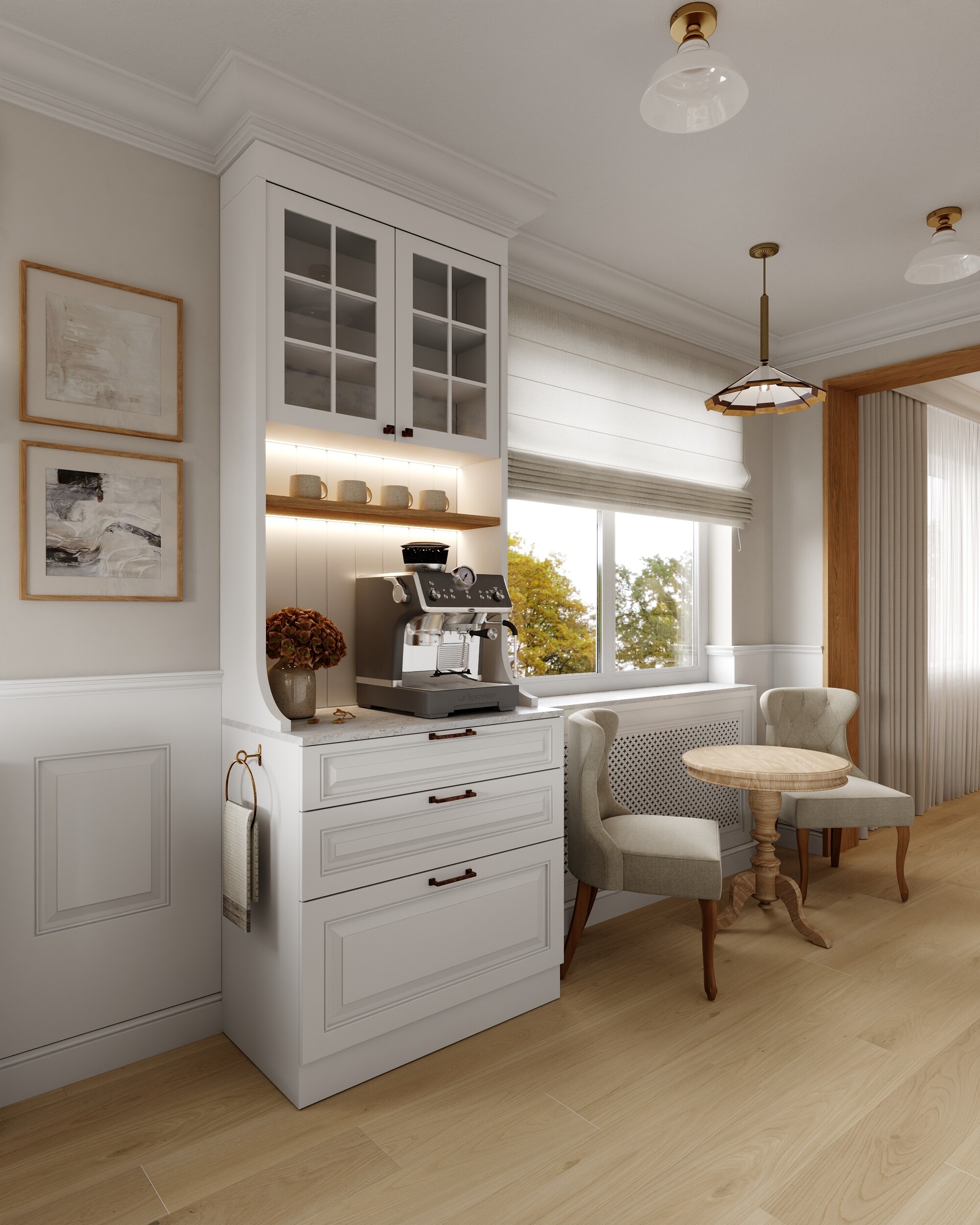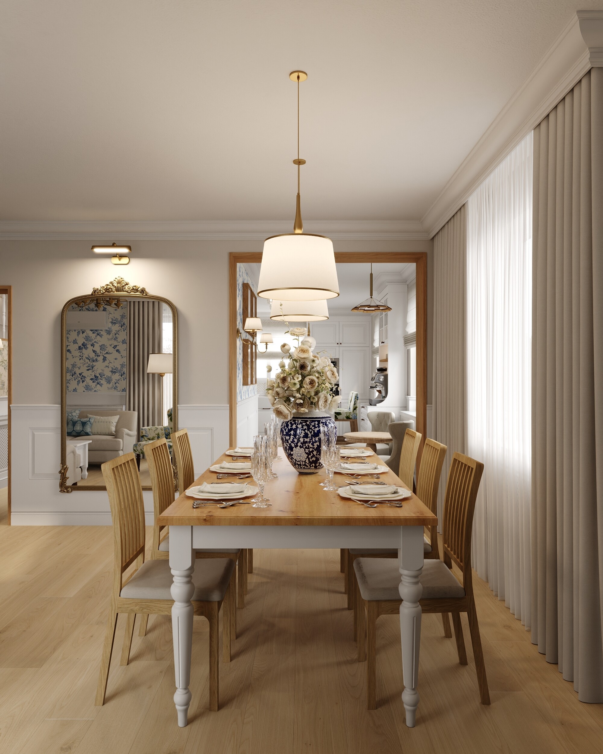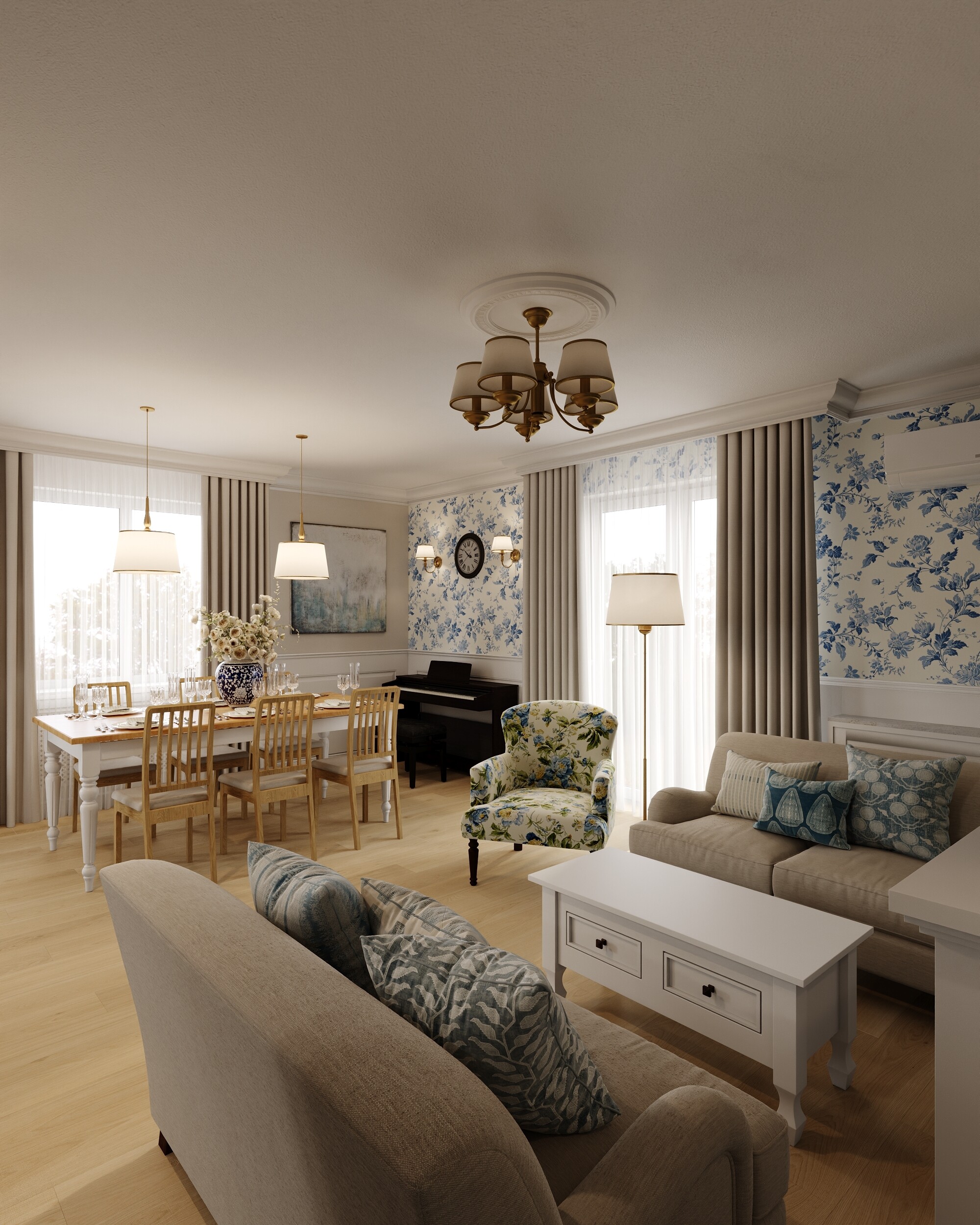 Baby blue – delikatny, pastelowy błękit jako kolor przewodni szafek kuchennych, frontów kredensów lub wyspy. Biel i krem – na ścianach, blatach z kamienia lub w płytkach podłogowych. Naturalne drewno pojawia się w blatach kuchni, stołu, półkach, podłodze – dodaje ciepła i rustykalnego charakteru. Akcenty ciemniejsze w kolorze postarzanego mosiądzu przełamują lekkość baby blue i dodają charakteru.