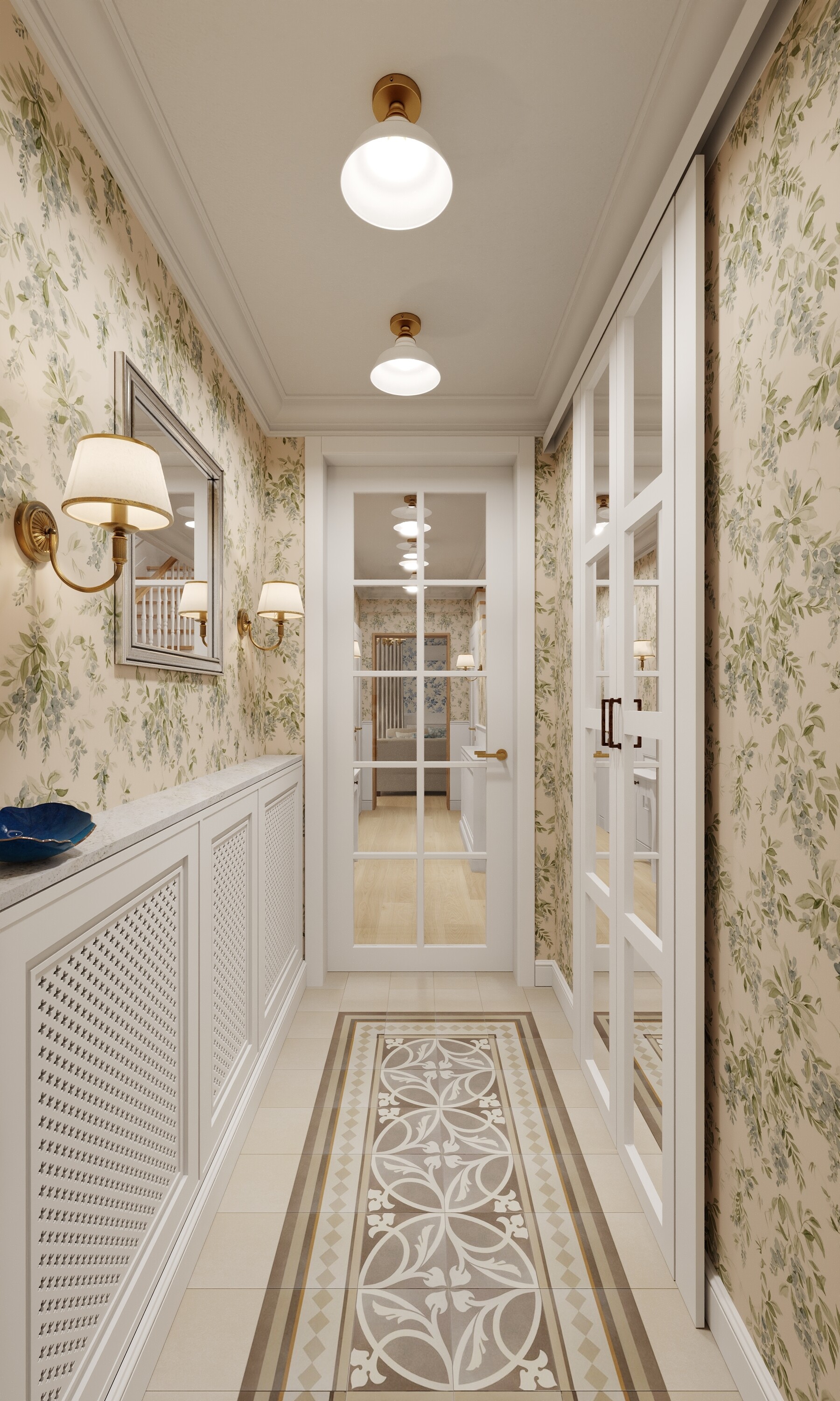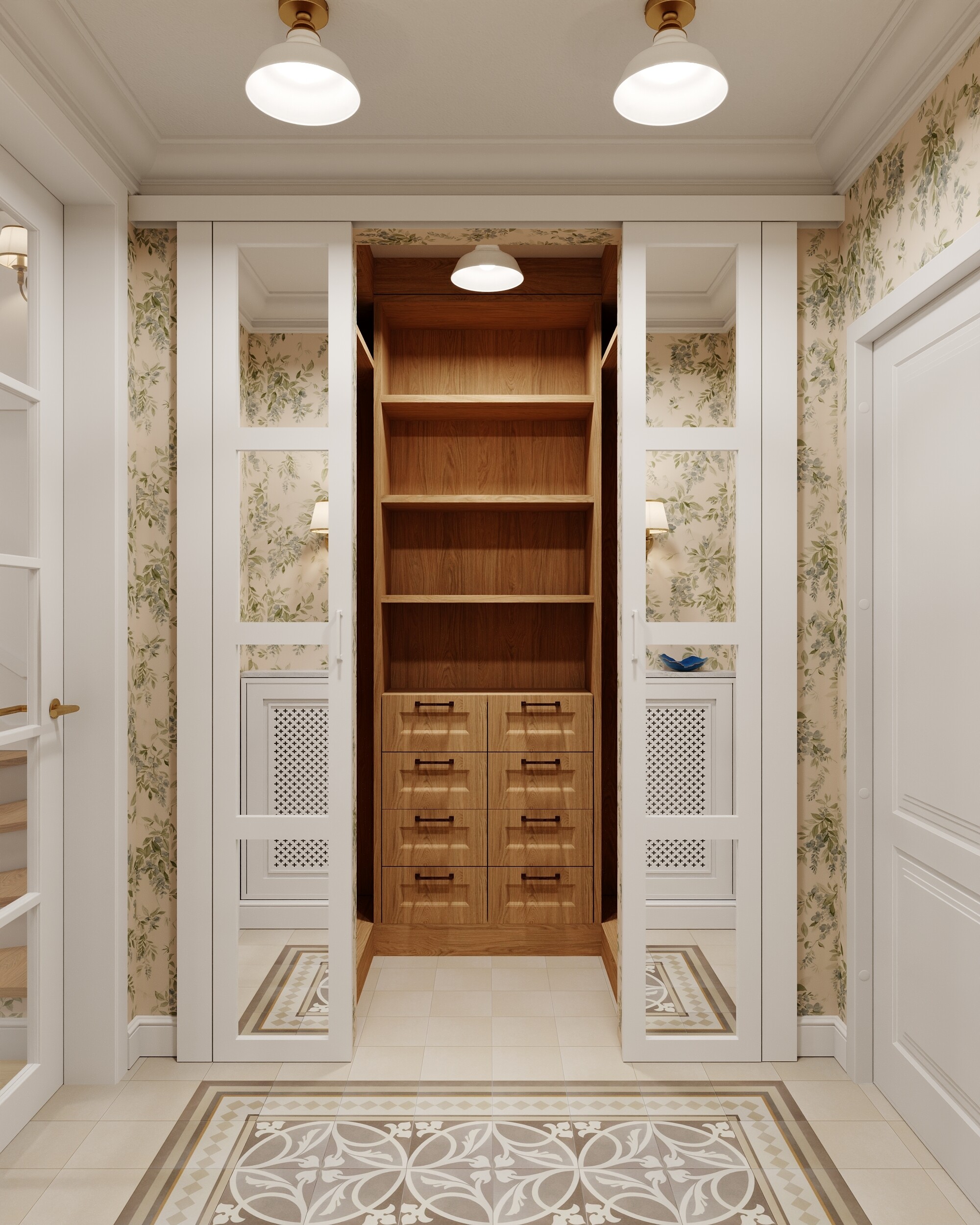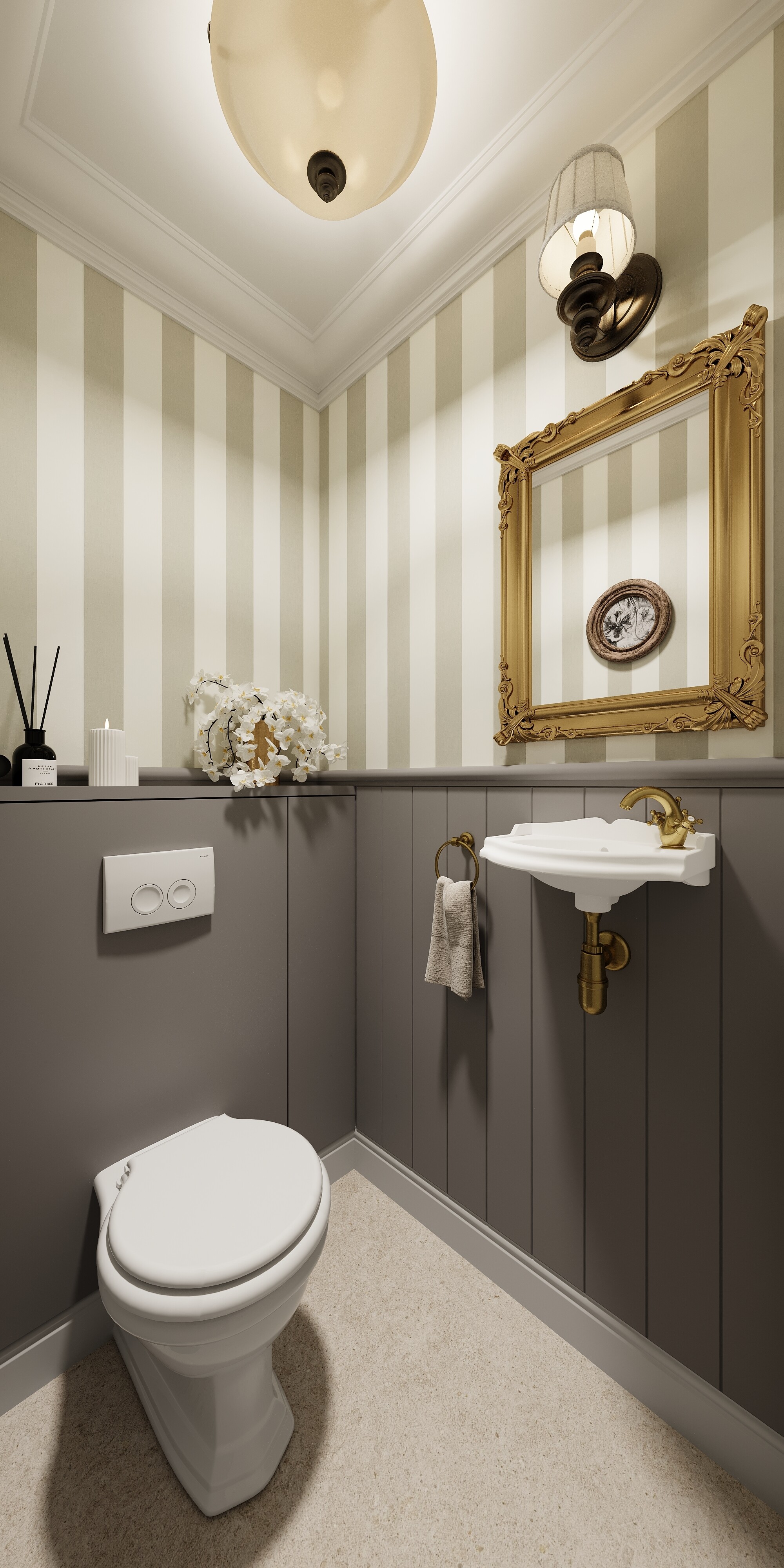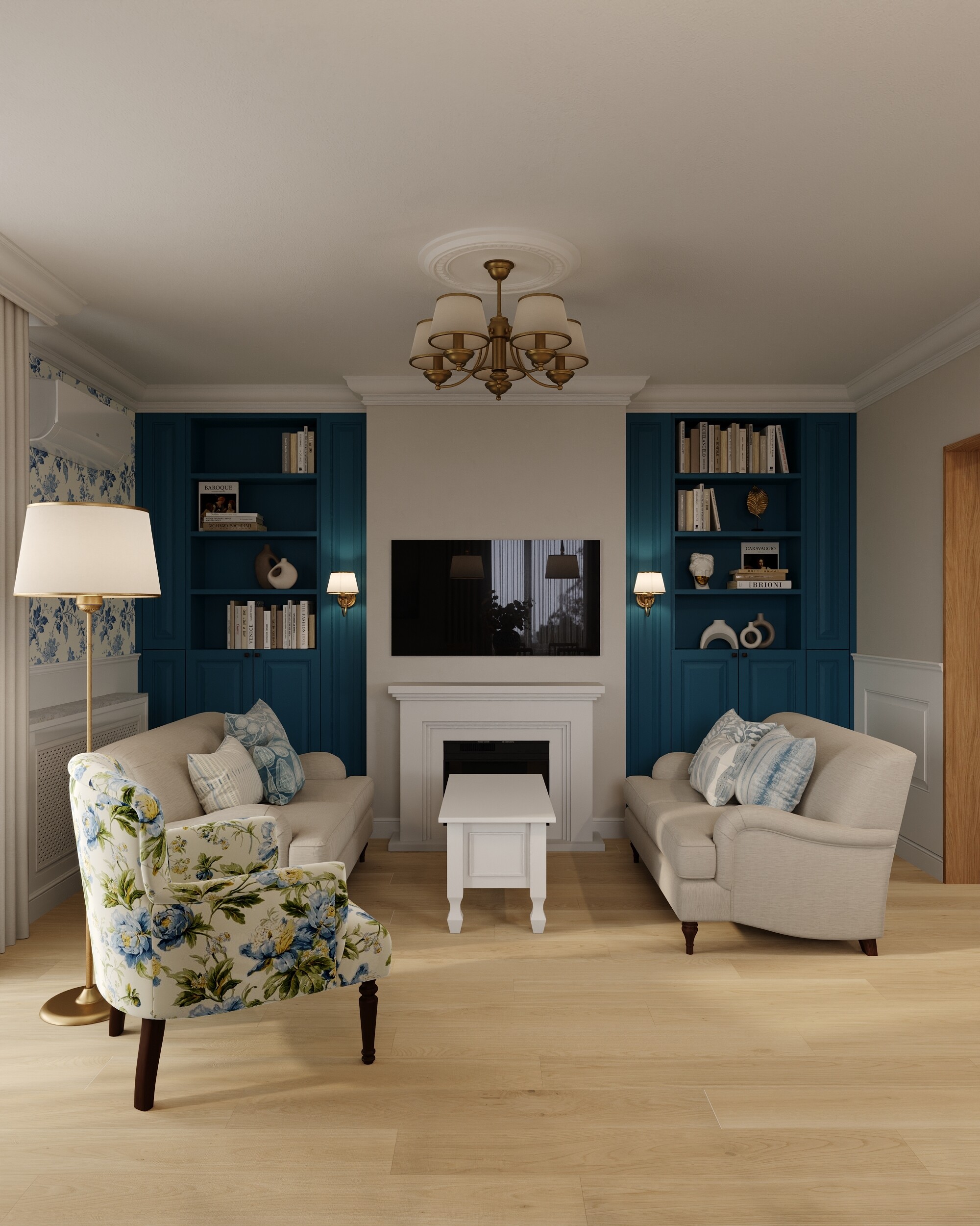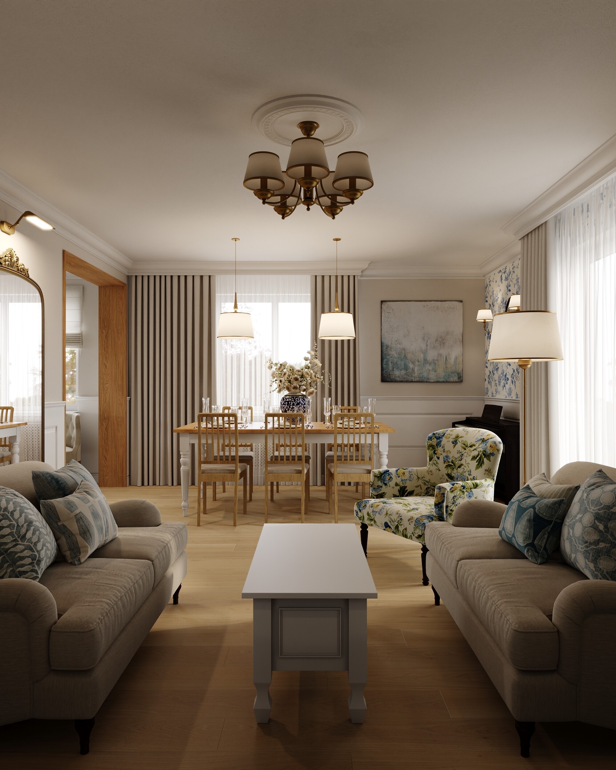 Baby blue – delikatny, pastelowy błękit jako kolor przewodni szafek kuchennych, frontów kredensów lub wyspy. Biel i krem – na ścianach, blatach z kamienia lub w płytkach podłogowych. Naturalne drewno pojawia się w blatach kuchni, stołu, półkach, podłodze – dodaje ciepła i rustykalnego charakteru. Akcenty ciemniejsze w kolorze postarzanego mosiądzu przełamują lekkość baby blue i dodają charakteru.