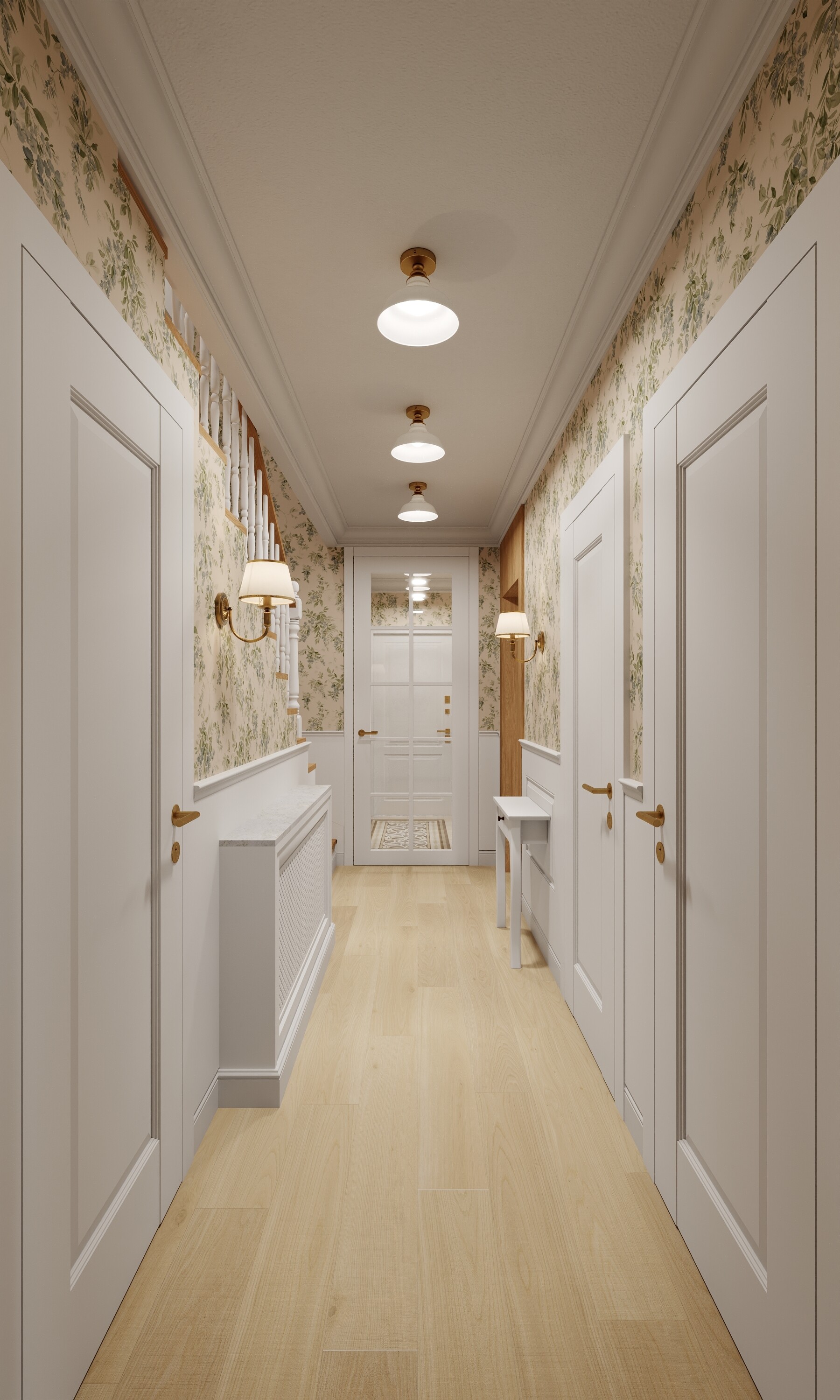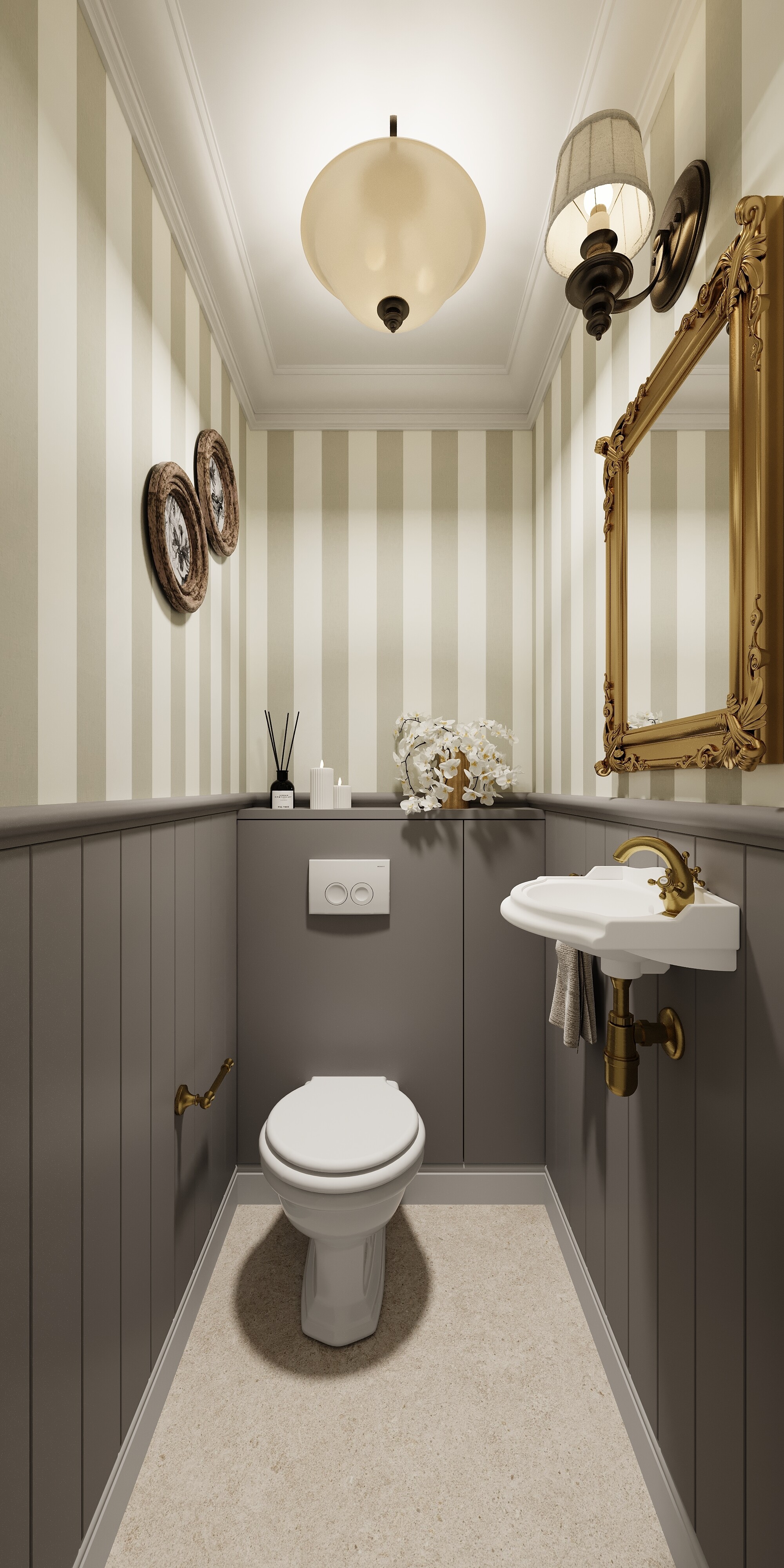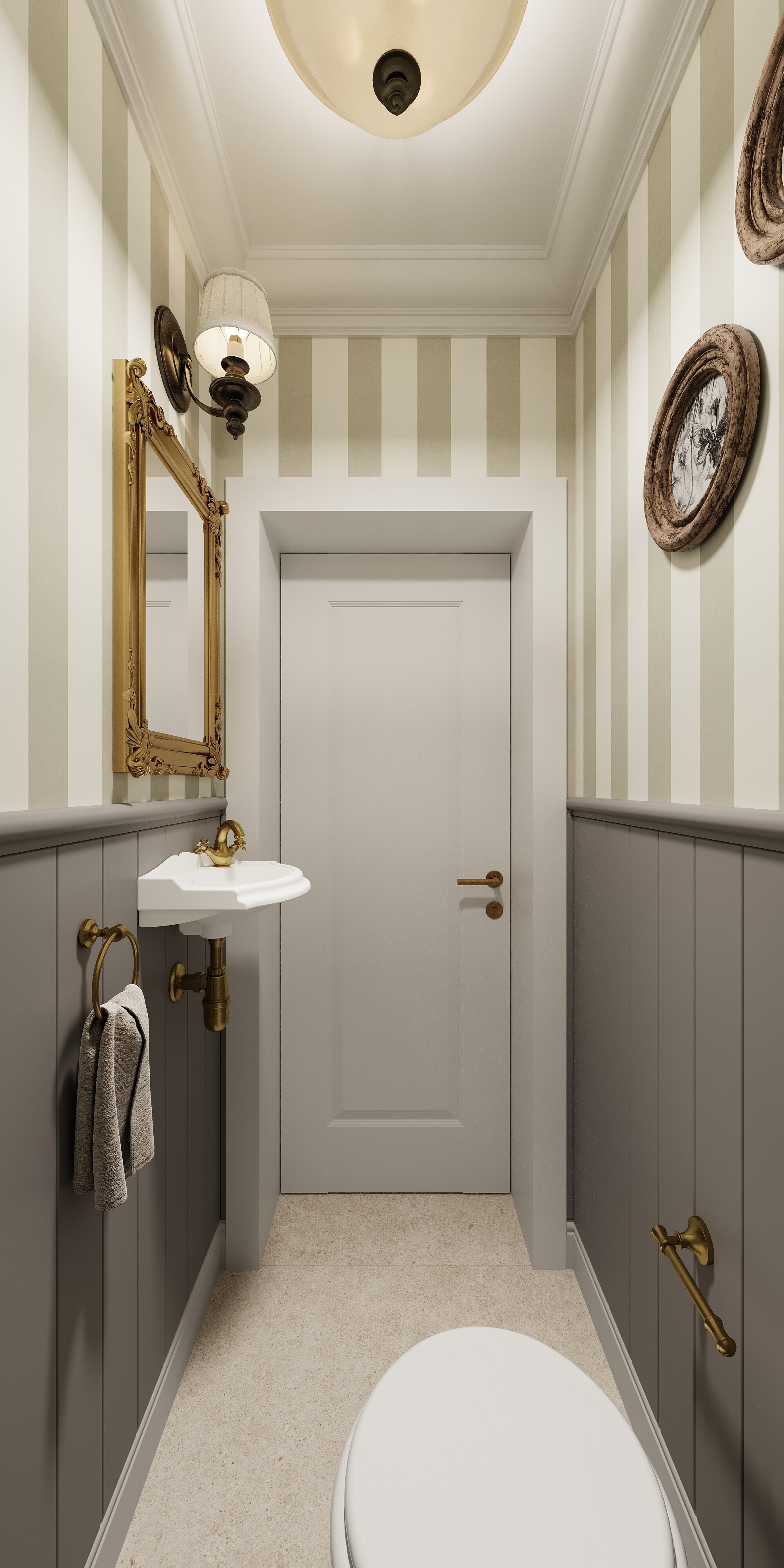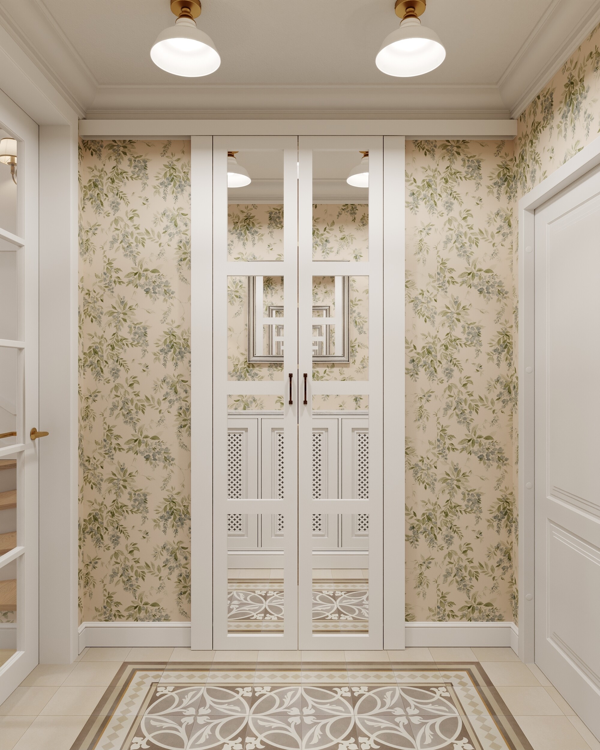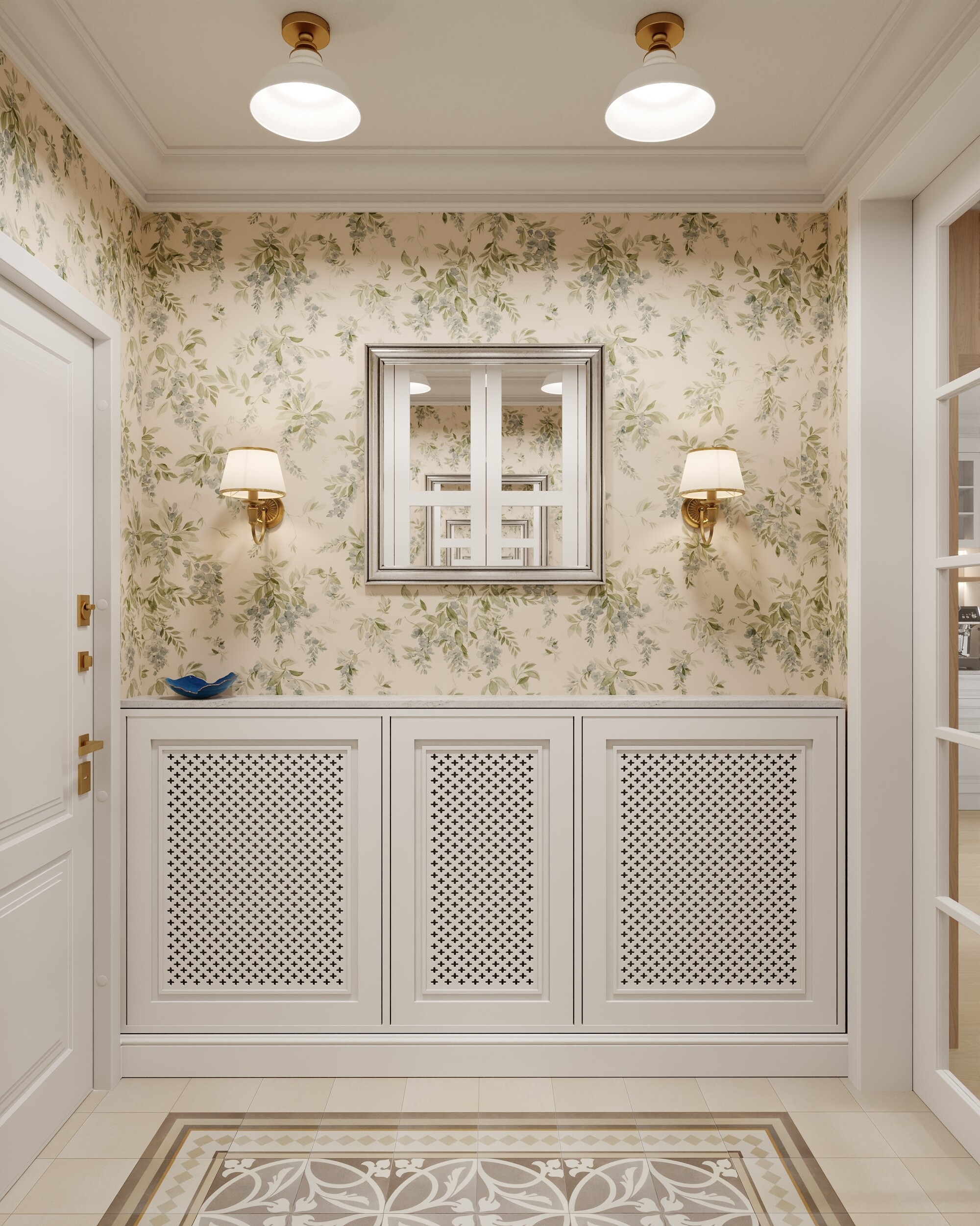 Baby blue – delikatny, pastelowy błękit jako kolor przewodni szafek kuchennych, frontów kredensów lub wyspy. Biel i krem – na ścianach, blatach z kamienia lub w płytkach podłogowych. Naturalne drewno pojawia się w blatach kuchni, stołu, półkach, podłodze – dodaje ciepła i rustykalnego charakteru. Akcenty ciemniejsze w kolorze postarzanego mosiądzu przełamują lekkość baby blue i dodają charakteru.