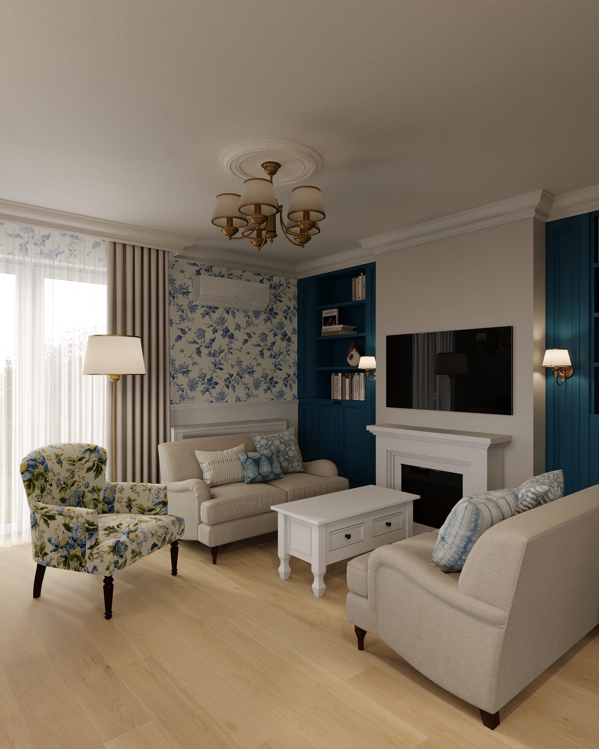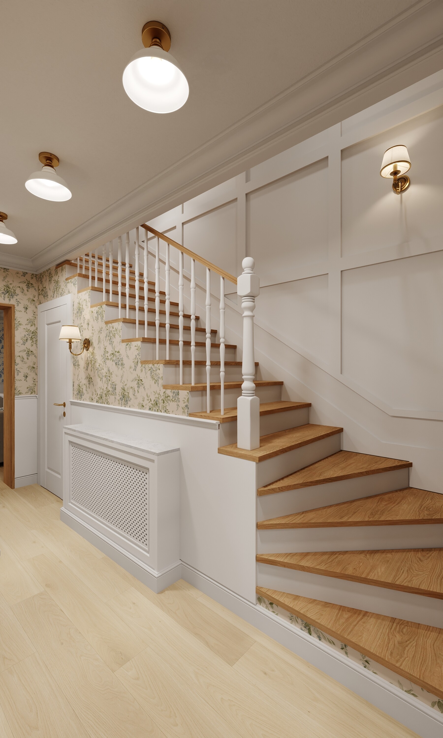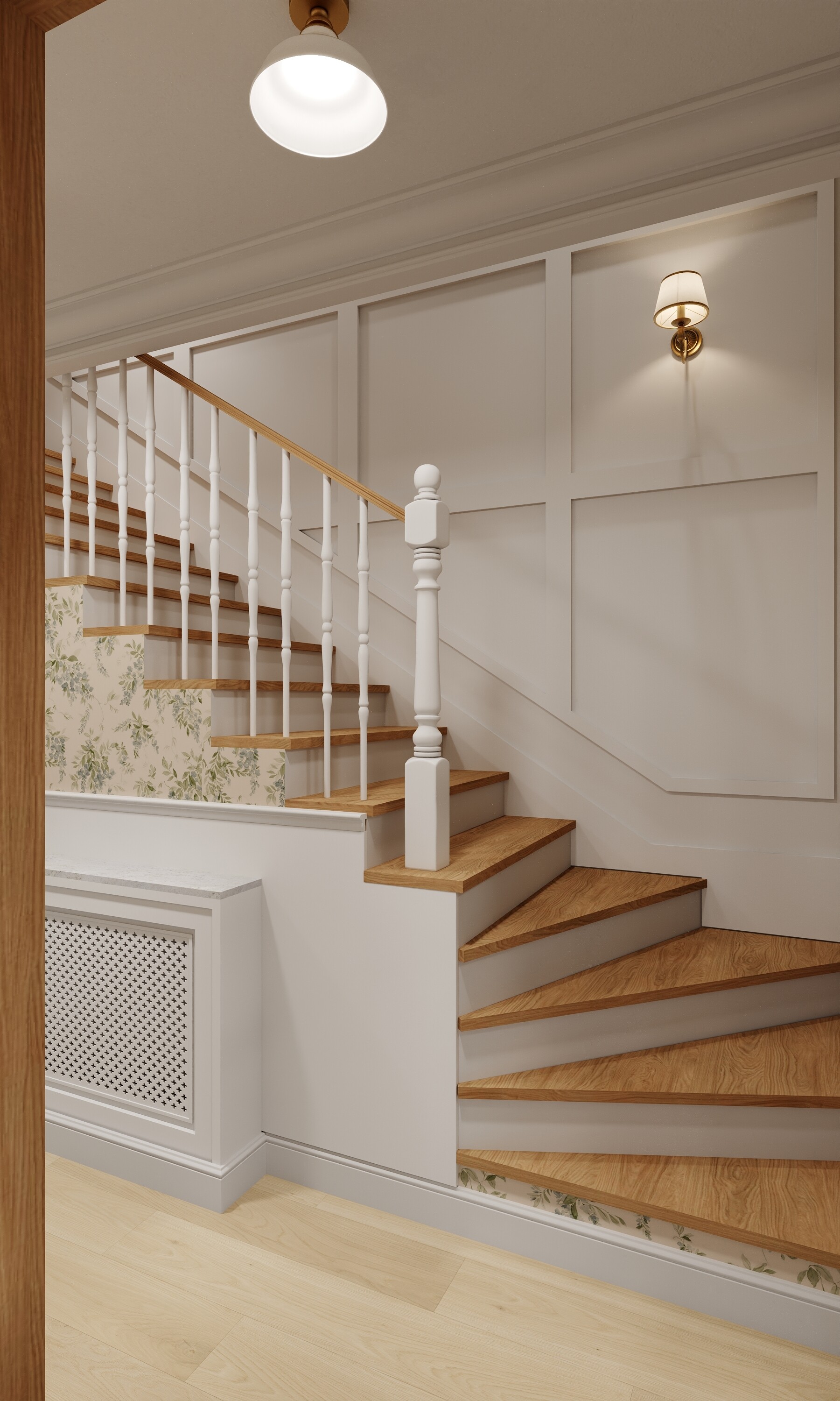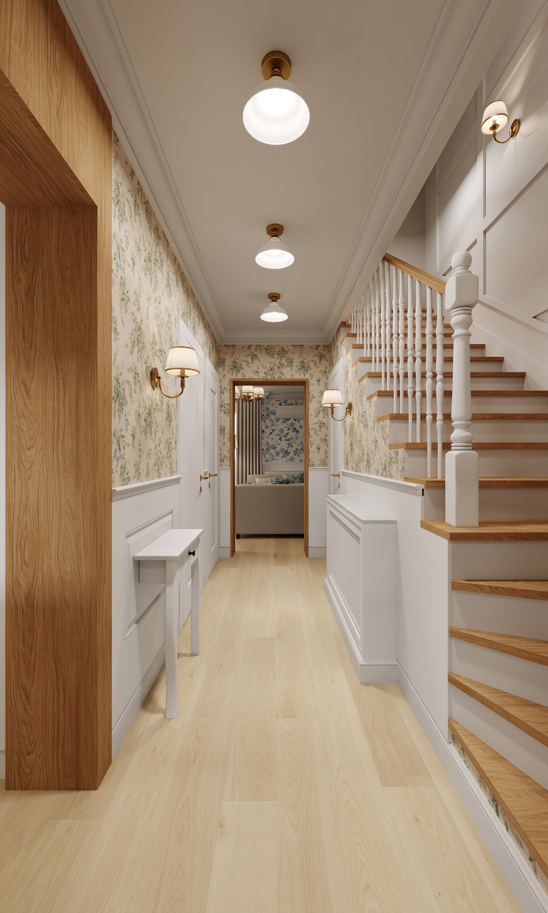 Projekt wnętrza tego domu to połączenie farmhouse z angielskim eleganckim stylem wnętrzarskim. Kuchnia w stylu farmhouse w odcieniach baby blue z akcentami stylu angielskiego wygląda sielsko, elegancko i jednocześnie świeżo. To zestawienie łączy domową przytulność rustykalnej kuchni z klasyczną harmonią angielskiej estetyki.