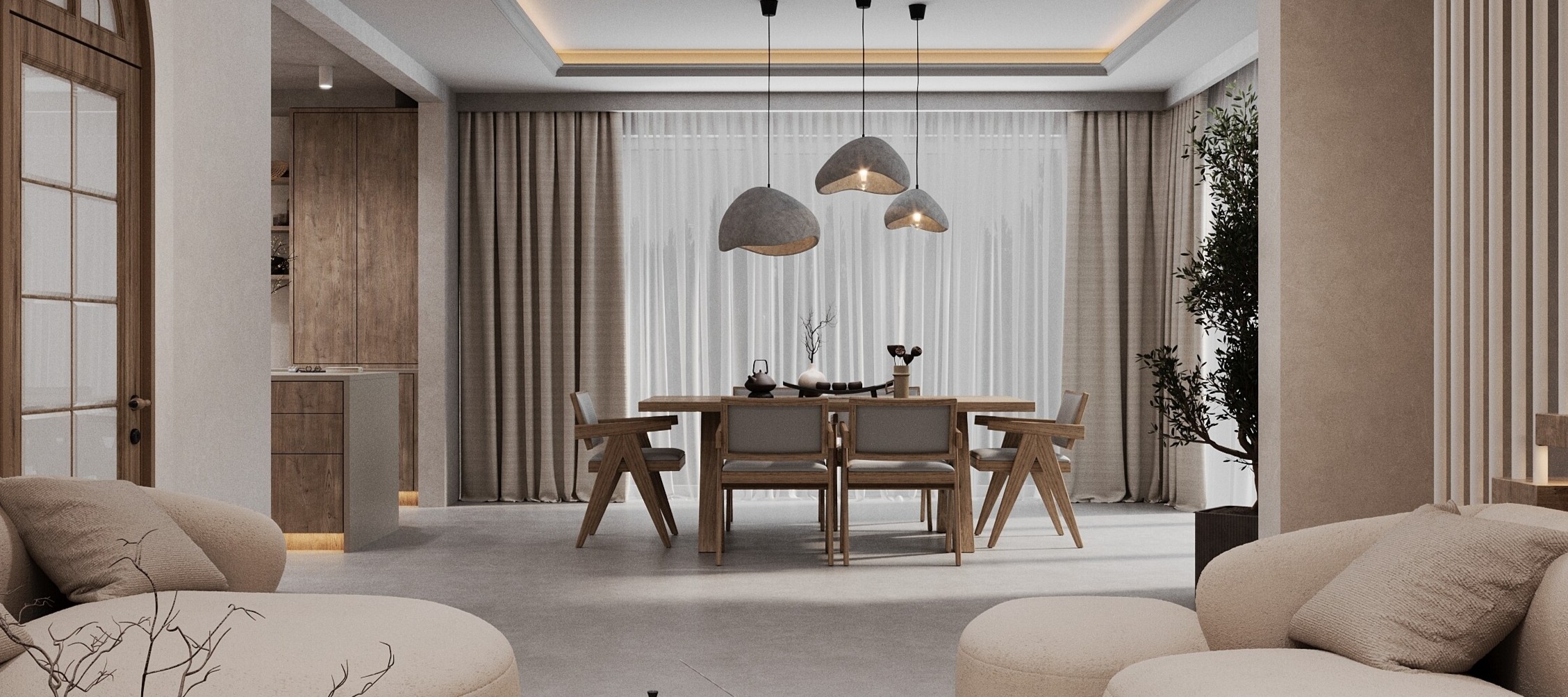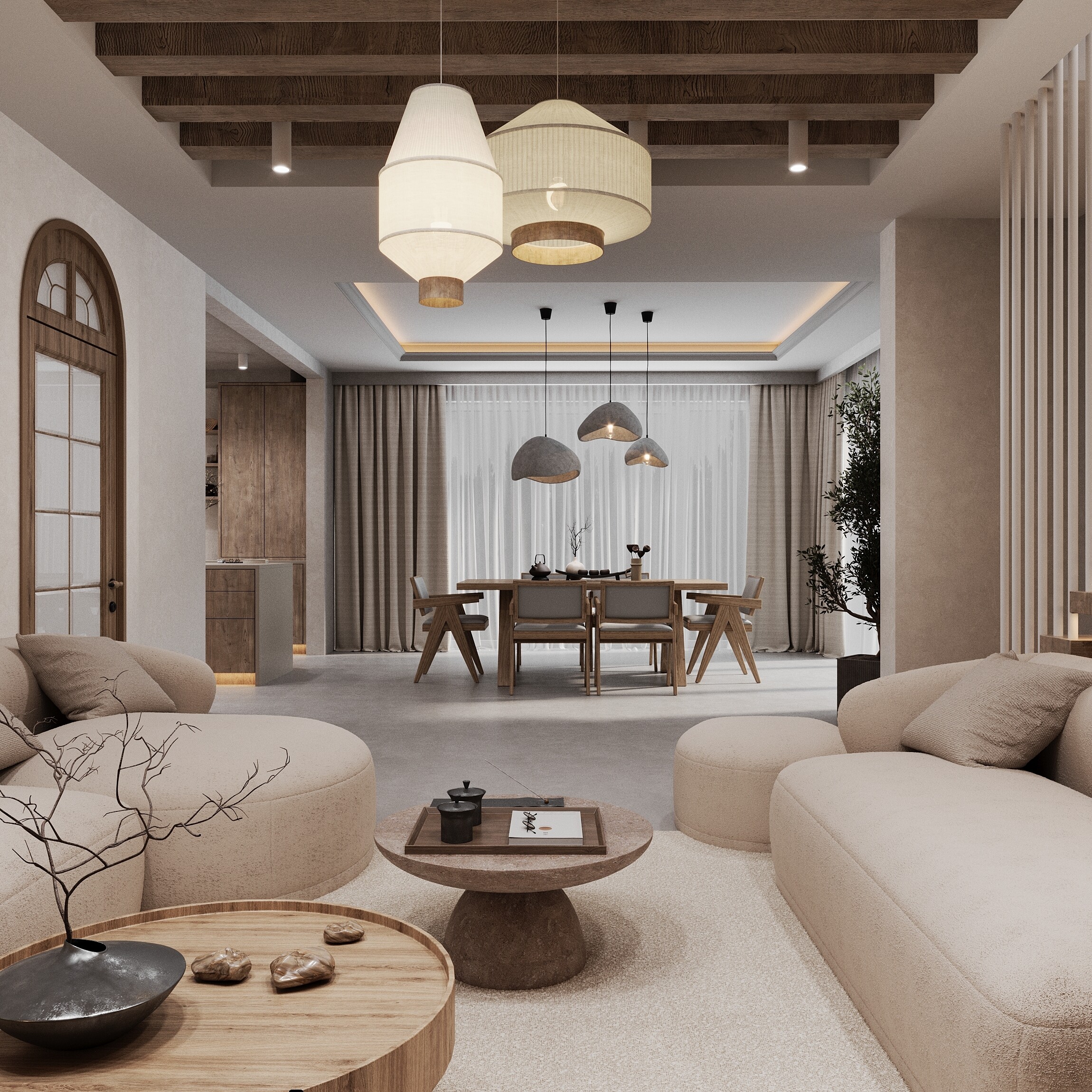 Połączenie japońskiej prostoty i minimalizmu z skandynawską funkcjonalnością i przytulnością. Dominują neutralne kolory, naturalne materiały i proste formy. Styl ten stawia na spokój, harmonię i uporządkowaną przestrzeń. Podłogi i ściany to mikrocement w odcieniach szarości wprowadza nowoczesną, gładką powierzchnię. Efekt wizualny jest matowy, lekko surowy, dobrze kontrastuje z ciepłem drewna. Materiały łatwe w utrzymaniu, odporne na wilgoć, idealne do kuchni, łazienki czy salonu. Wnętrze w stylu Japandi z mikrocementem, szarością i drewnem ma bardzo charakterystyczną atmosferę — subtelnie łączy spokój, prostotę i naturalne ciepło. Dominuje łagodna, stonowana paleta kolorów: szarości mikrocementu tworzą neutralne tło, a drewno wprowadza naturalne, ciepłe akcenty. Przestrzeń wydaje się uporządkowana i pozbawiona zbędnego chaosu – wszystko ma swoje miejsce.