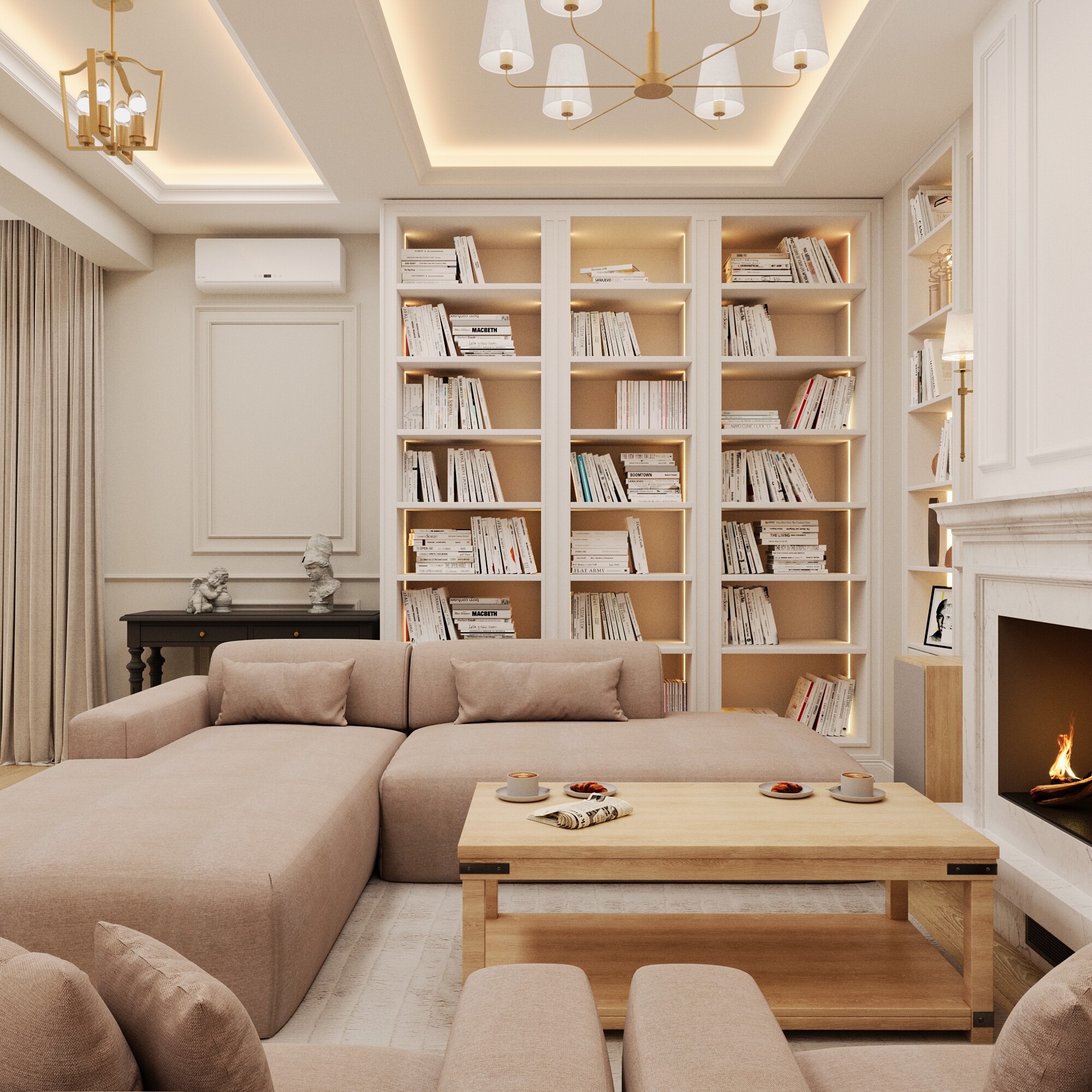 Projekt wnętrz tego domu to eleganckie połączenie klasycznego stylu z elementami stylu amerykańskiego, zaprojektowane z myślą o komforcie i funkcjonalności rodziny. Kluczowym założeniem było zachowanie ponadczasowych elementów klasycznych, takich jak sztukaterie ścienne i dekoracyjne frezowania na meblach, przy jednoczesnym zastosowaniu nowoczesnych rozwiązań aranżacyjnych. Wnętrze charakteryzuje się stonowaną kolorystyką, w której dominują monochromatyczne, pastelowe okładziny ścienne, tworzące harmonijną i przytulną atmosferę.