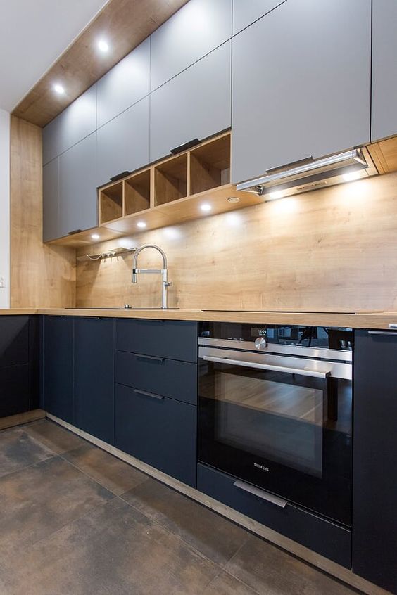 Popularnym oświetleniem blatu roboczego w kuchni jest taśma LED umieszczona w profilu w płycie meblowej u spodu szafek wiszących. Możesz użyć ściemniacza, aby regulować natężenie światła. Innym rozwiązaniem jest oświetleniowy panel LED.