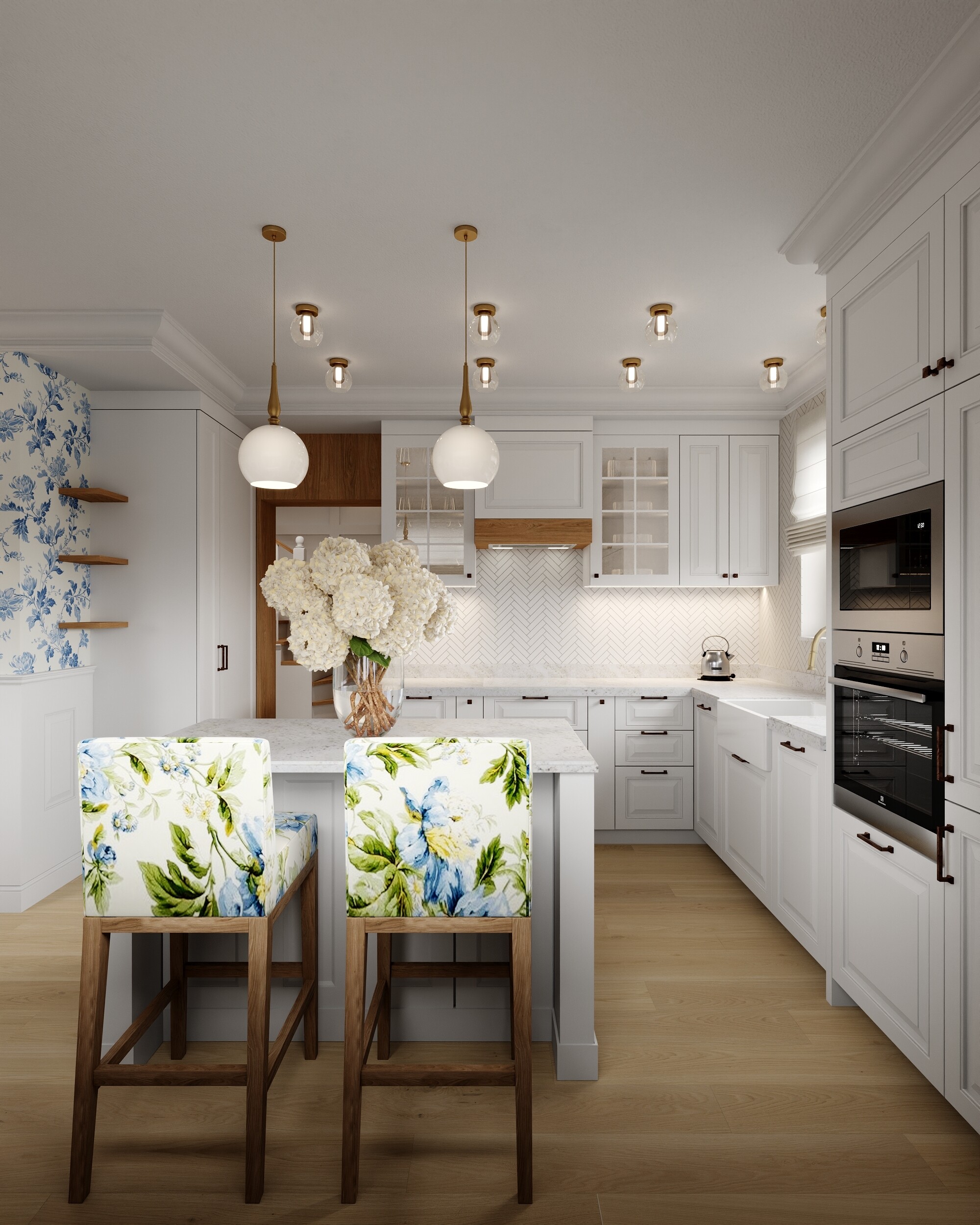 Projekt wnętrza tego domu to połączenie farmhouse z angielskim eleganckim stylem wnętrzarskim. Kuchnia w stylu farmhouse w odcieniach baby blue z akcentami stylu angielskiego wygląda sielsko, elegancko i jednocześnie świeżo. To zestawienie łączy domową przytulność rustykalnej kuchni z klasyczną harmonią angielskiej estetyki.