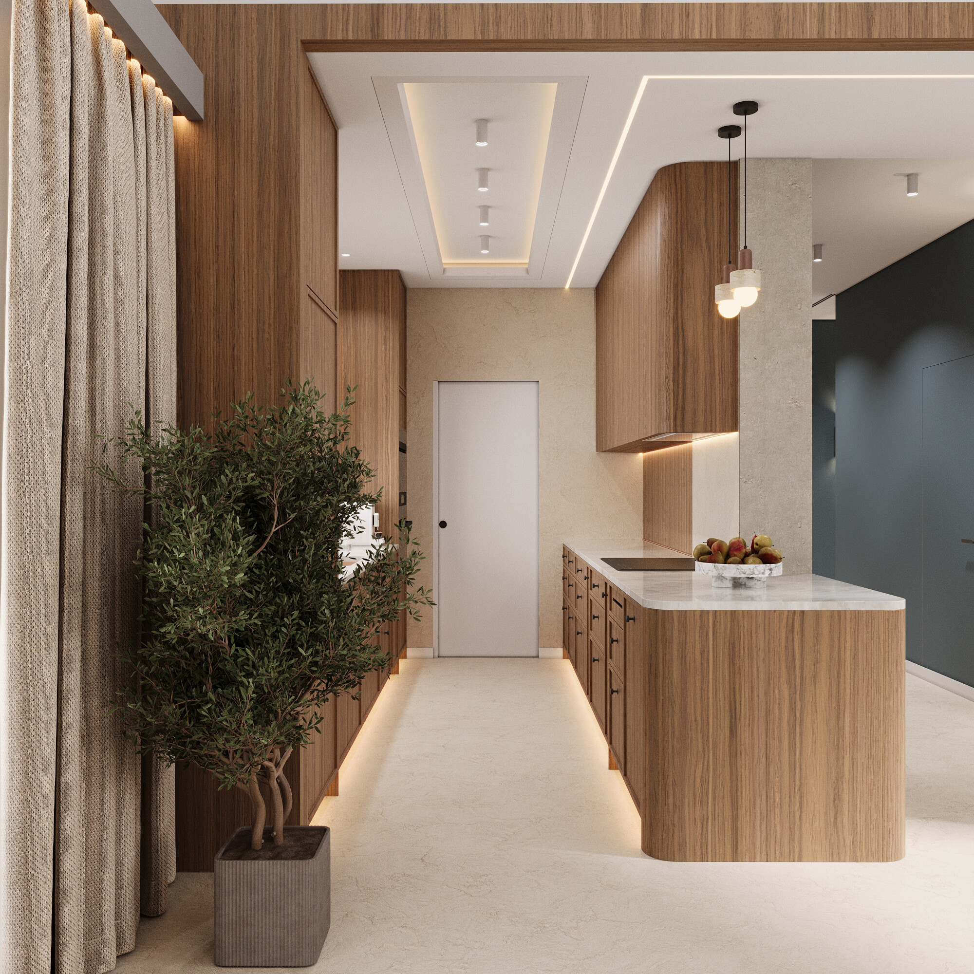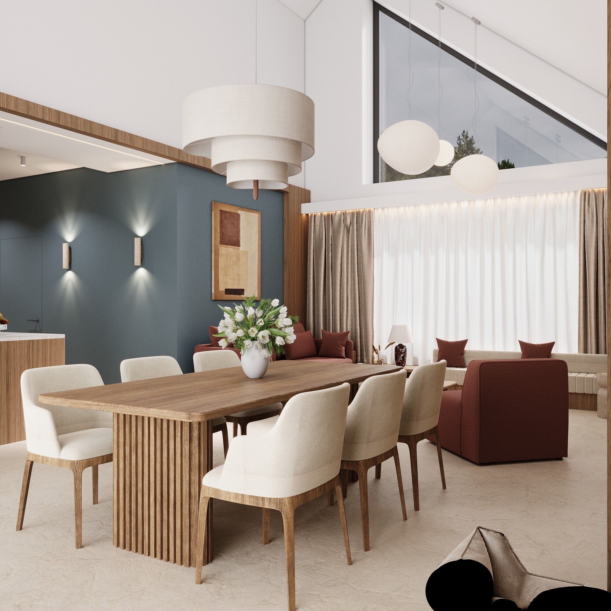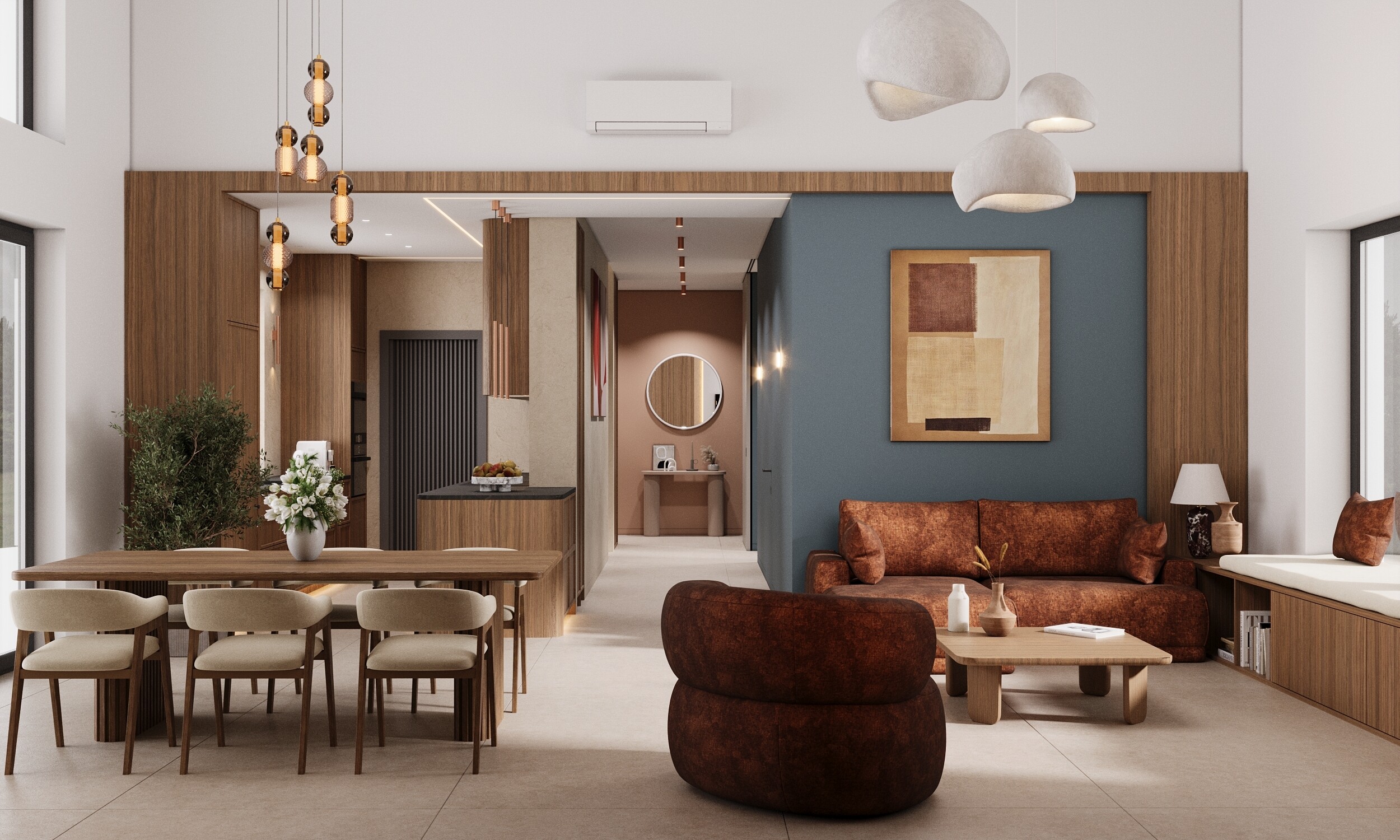 i odważny wyrazisty kolor we wnętrzu. To przestrzeń, która czerpie z nowoczesnego designu, ale spokojnie można ją opisać i zinterpretować w duchu stylu japandi. Przestrzeń jest otwarta, harmonijna, ale nie przeładowana detalami – to wpisuje się w filozofię minimalizmu japandi. Stonowane oświetlenie punktowe i kinkiety tworzą spokojny, relaksujący nastrój. Obecność naturalnych barw (ziemia, piasek, drewno) połączona z przytulnym światłem to dokładnie to, co buduje balans w japandi. Pojawia się głęboki niebieskoszary akcent na ścianie, który dodaje wyciszenia. W tle widoczny jest ceglany odcień terakoty w strefie konsoli, co wprowadza nutę ziemistego, naturalnego ciepła. Ciemne blaty i detale wprowadzają kontrast i elegancję.